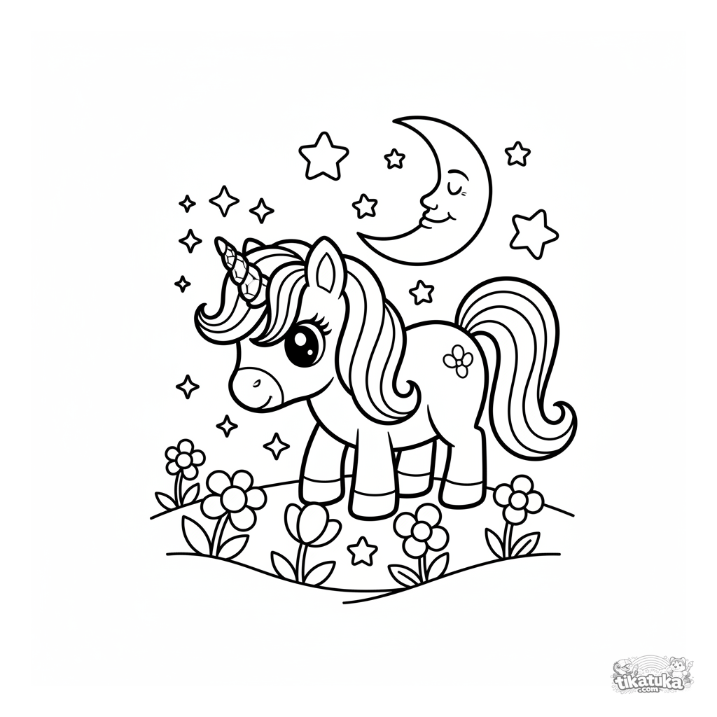 Раскраска с волшебным пони-единорогом, который пасётся на светящихся цветах в лунном лугу. Для малышей 2-5 лет, крупные простые формы.