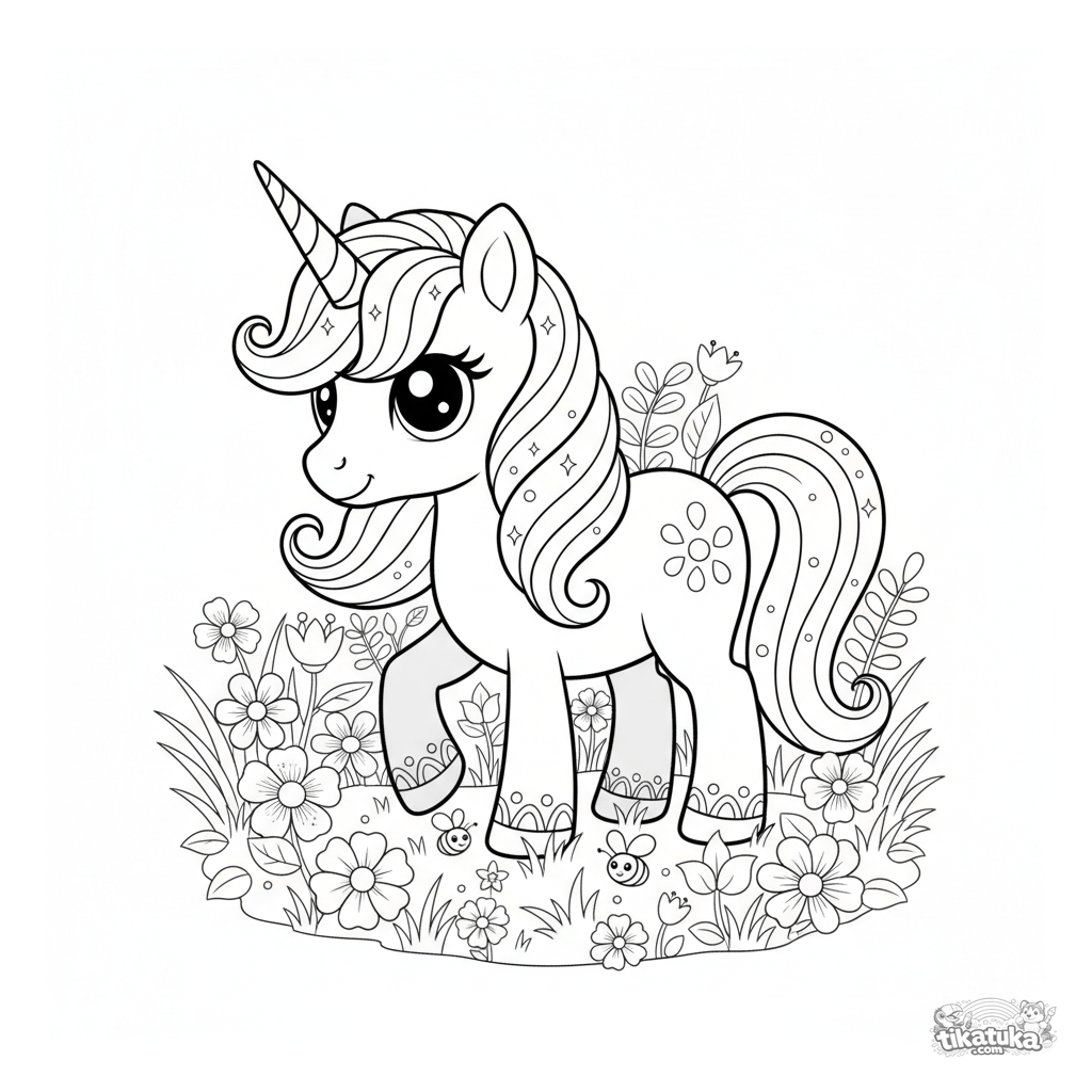 Раскраска с волшебным единорогом-пони, пасущимся на зачарованном лугу с радужной гривой. Для детей 6-9 лет. Много деталей для раскрашивания.