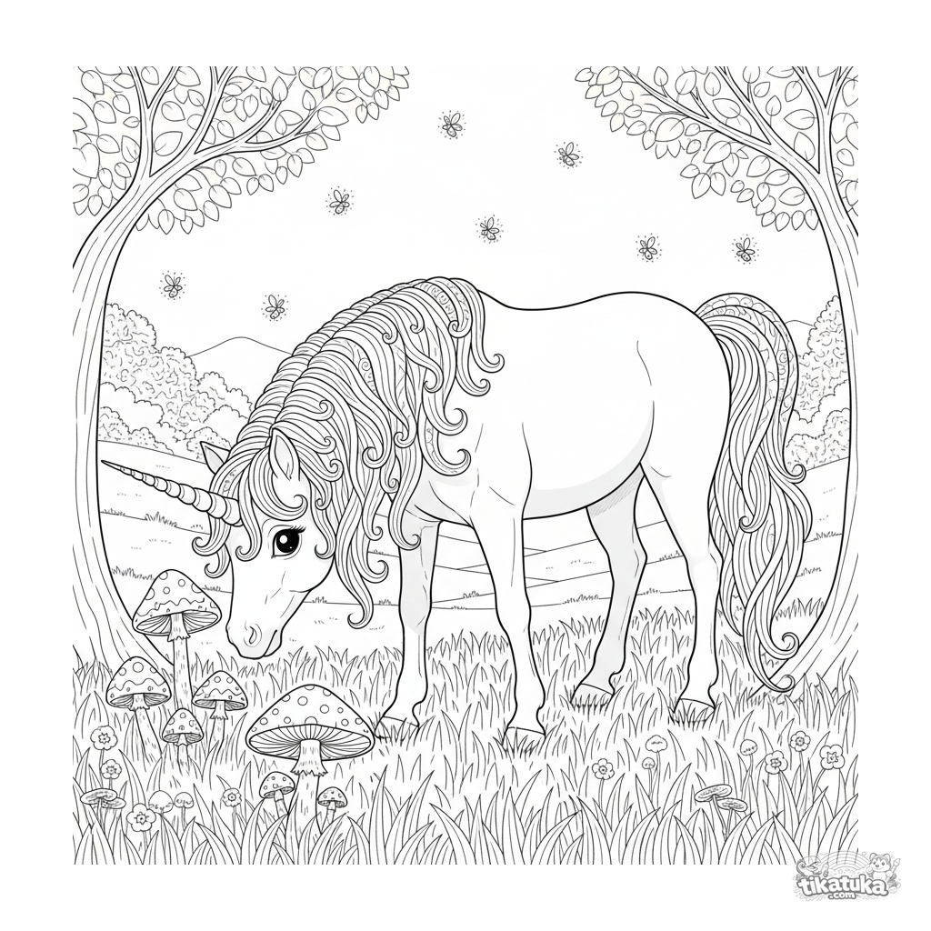 Сложная раскраска для детей постарше: волшебный пони-единорог пасется в лунном свете среди светящихся грибов. Высокая детализация для 7-12 лет.