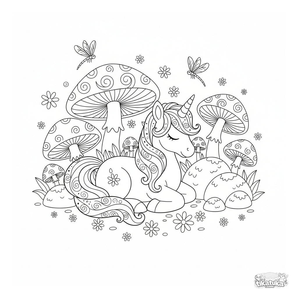 Раскраска с волшебным пони-единорогом, спящим в зачарованной роще среди светящихся грибов. Для детей 6-9 лет. Много деталей для раскрашивания.