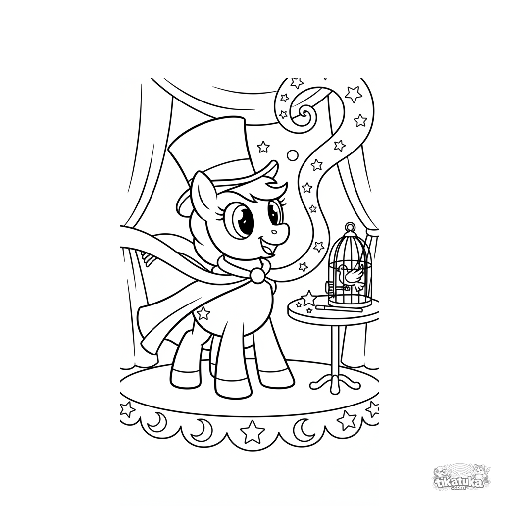 Весёлая раскраска для детей 4-6 лет: пони-фокусник вытягивает бесконечный шарф из шляпы на сцене. Яркий ретро-стиль, простые формы, забавный сюжет.