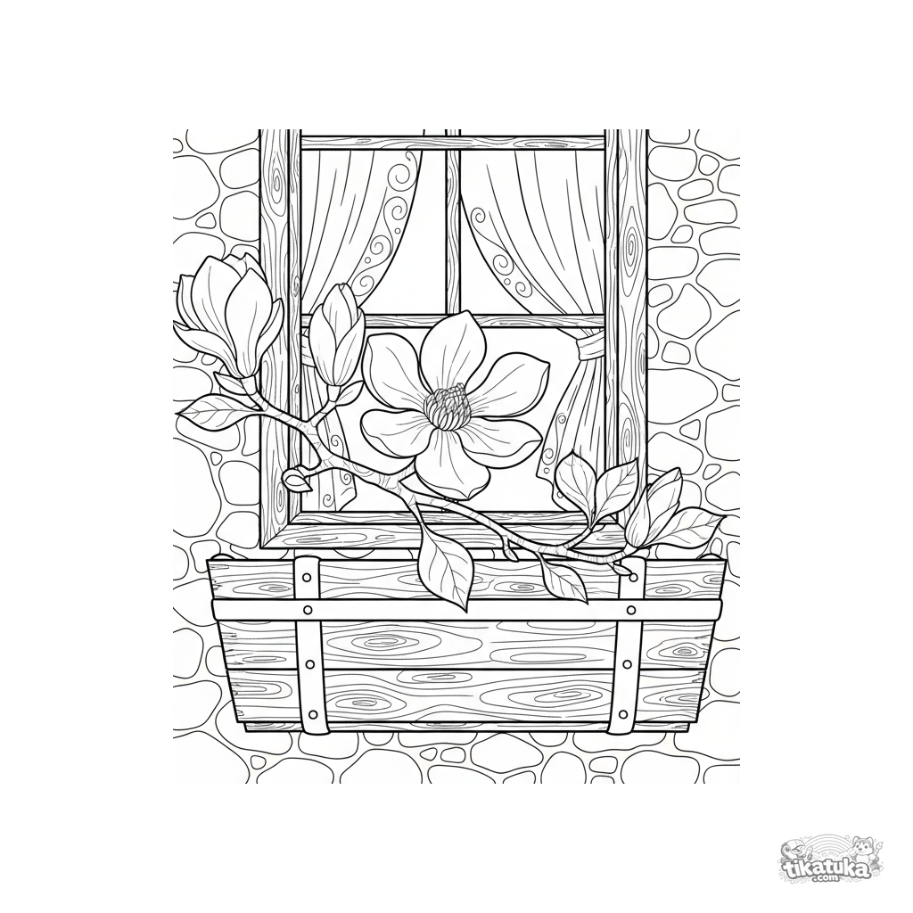 Детальная раскраска ветки магнолии в оконном ящике для детей 10-12 лет. Изображен цветущий побег на фоне каменной стены и штор.