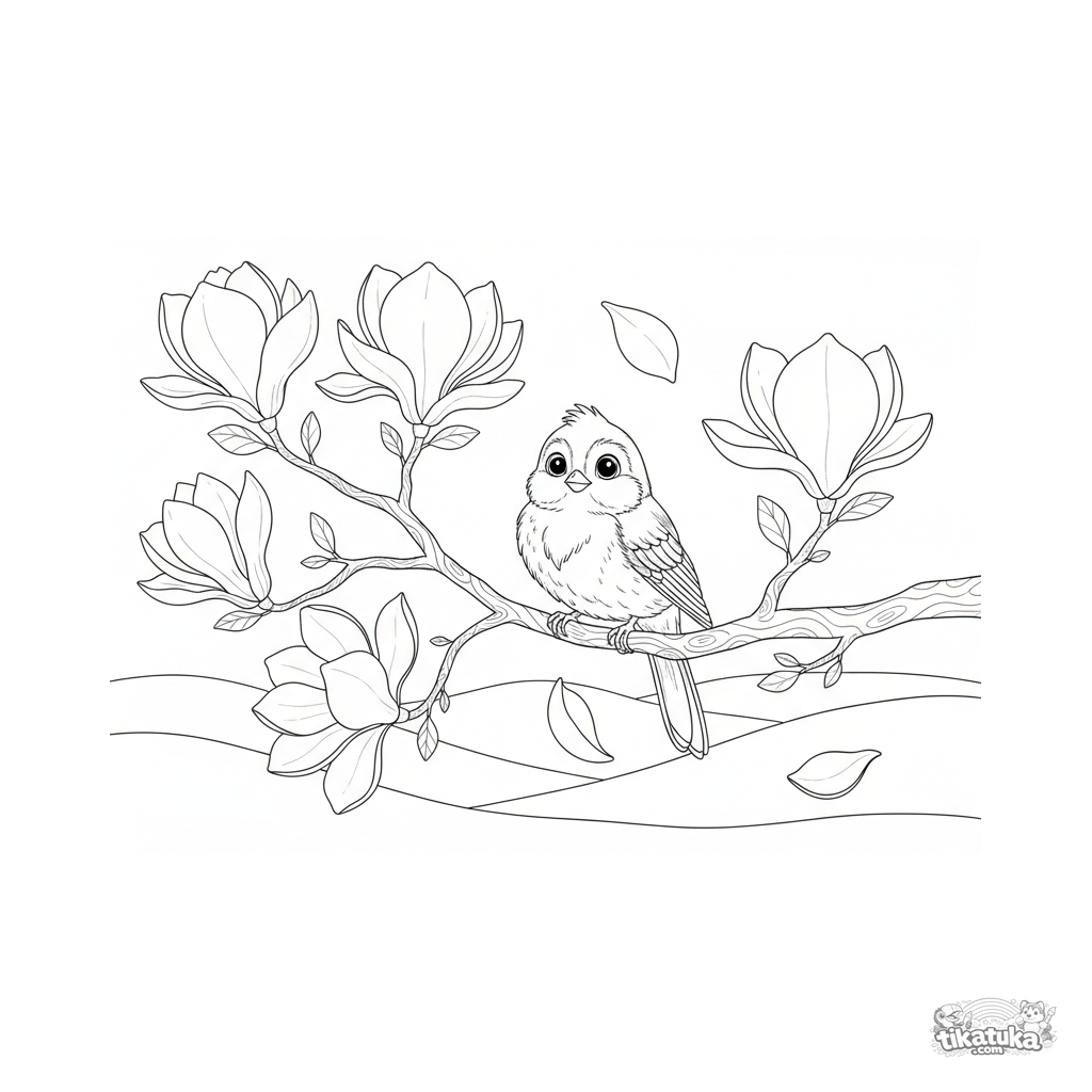 Сложная раскраска для детей 10-12 лет: цветущая ветка магнолии с опадающими лепестками и птичкой. Натуралистичный стиль, высокая детализация лепестков и перьев.