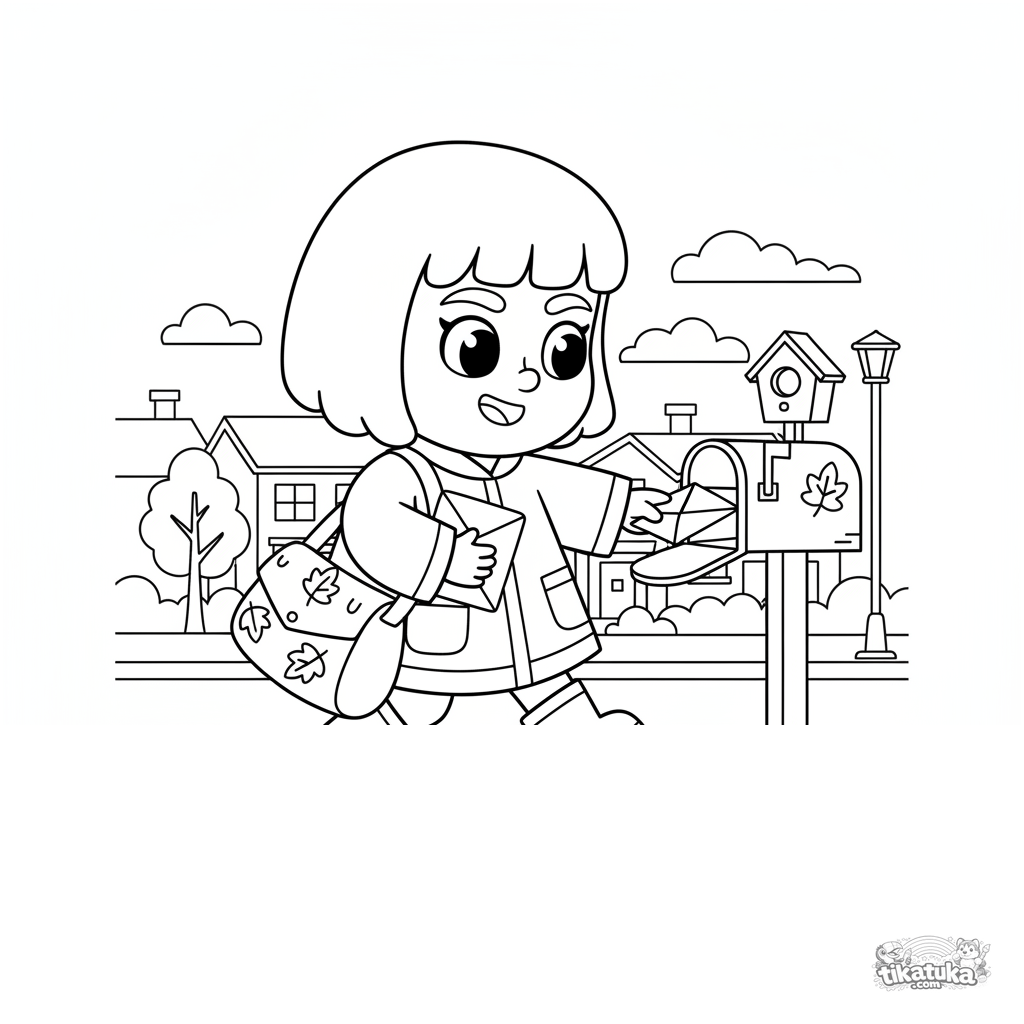 Раскраска для детей 7-9 лет: почтальон в плаще и сапогах осторожно переступает через лужу, доставляя письма осенним дождём. Почтовый ящик, листья, сумка с письмами.