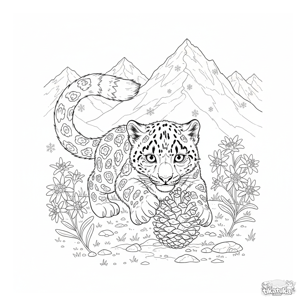 Раскраска с детёнышем снежного барса в гималайском лугу. Для детей 6-9 лет. Изображён пушистый котёнок, играющий с шишкой на фоне гор.