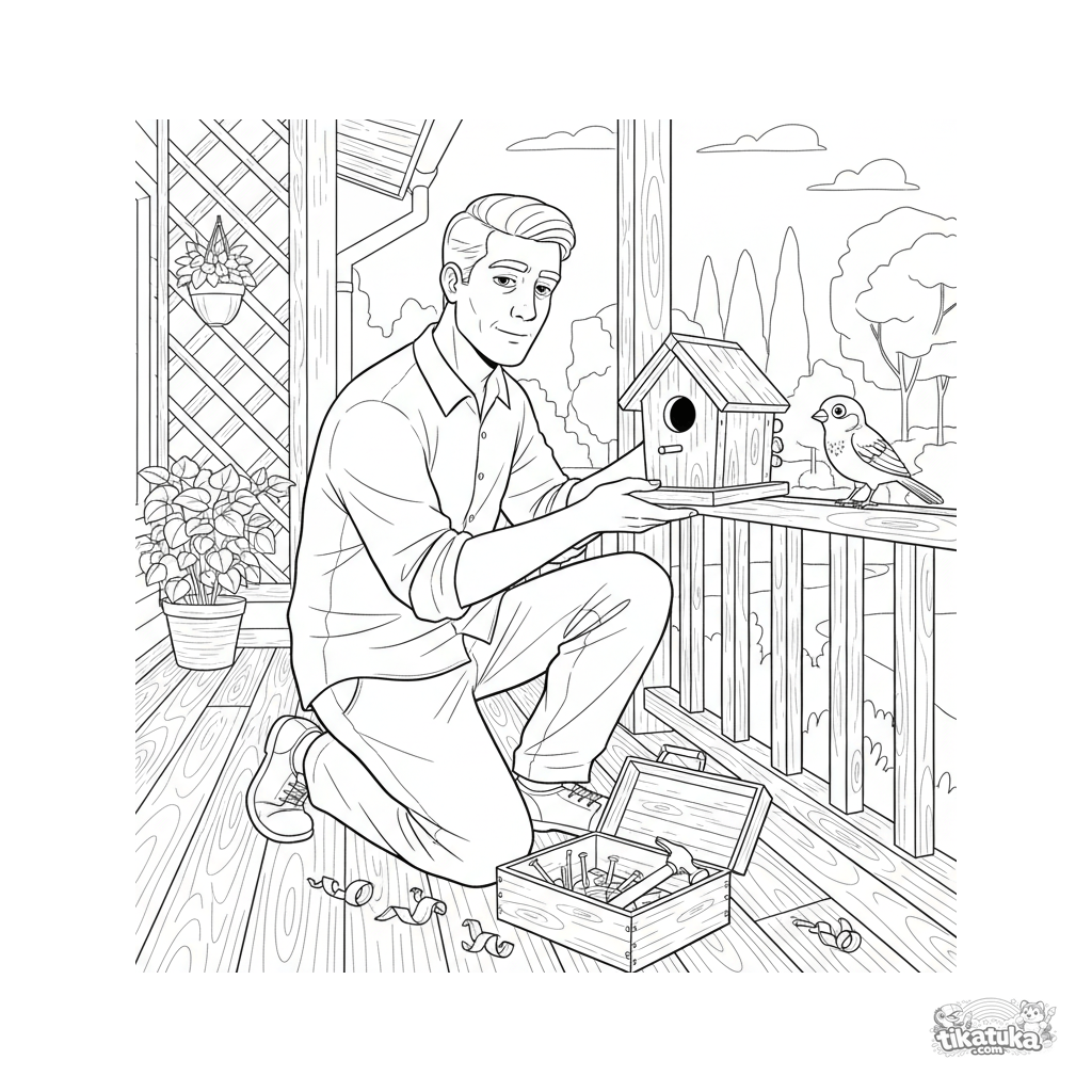Детальная раскраска для детей 10-12 лет: мужчина чинит скворечник на перилах дачной веранды. Сцена с инструментами, стружкой и птичкой, интересна для любителей техники и природы.