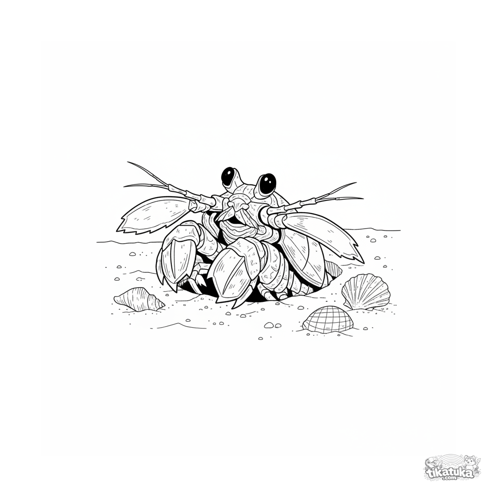 Детализированная раскраска для детей 10-12 лет: рак-богомол выглядывает из норы на солнечном мелководье. Стиль старинной гравюры с четкими контурами и узорами.