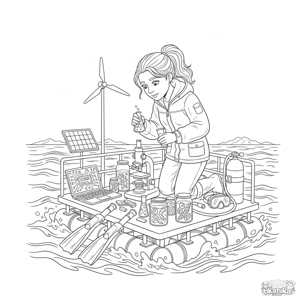 Раскраска для детей 10-12 лет: морская исследовательская лаборатория на плавучей платформе. Ученый изучает образцы воды, вокруг оборудование и приборы. Сложная детализированная сцена.
