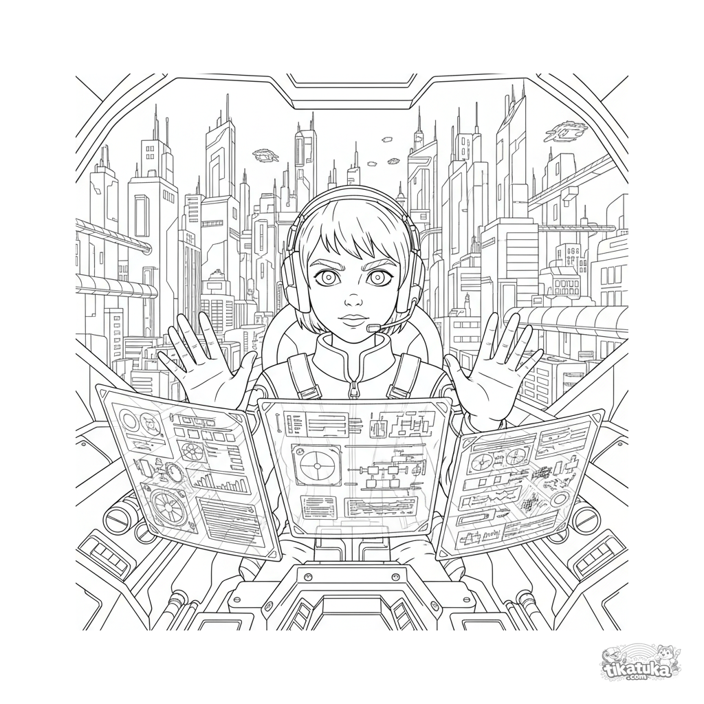 Сложная раскраска в аниме-стиле для детей 10-12 лет: пилот в кабине гигантского меха запускает диагностику на голографических панелях, за окном виден город будущего.