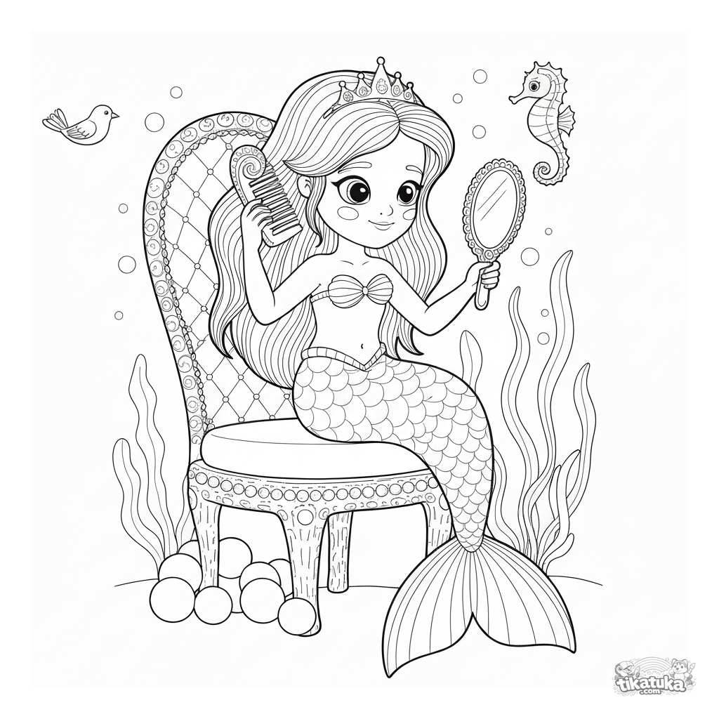 Раскраска с русалкой-принцессой, которая расчёсывает волосы на коралловом троне. Для детей 6-9 лет. Много деталей для творческого раскрашивания.
