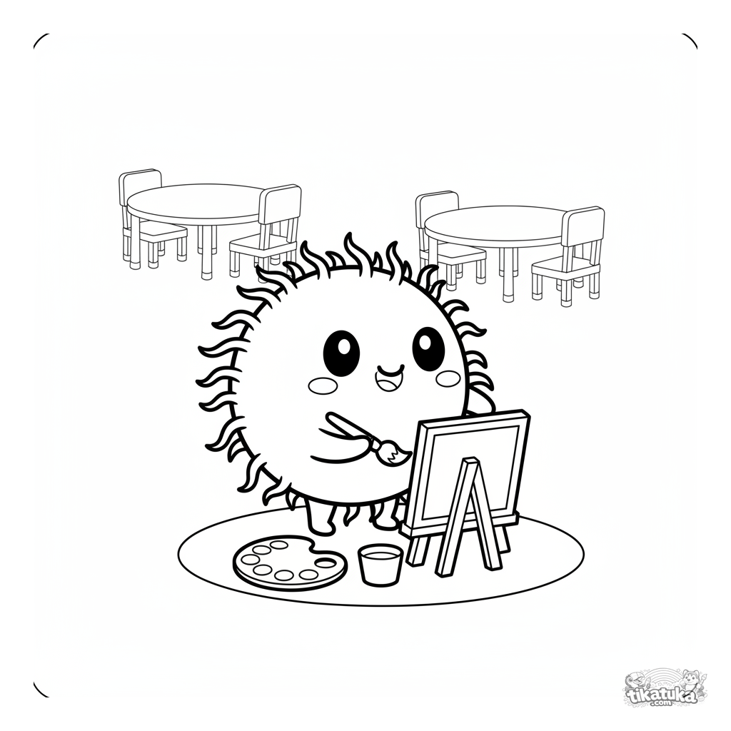 Раскраска для малышей 2-3 года: добрый микроб-художник рисует у мольберта в классе. Простые крупные формы для первого раскрашивания.