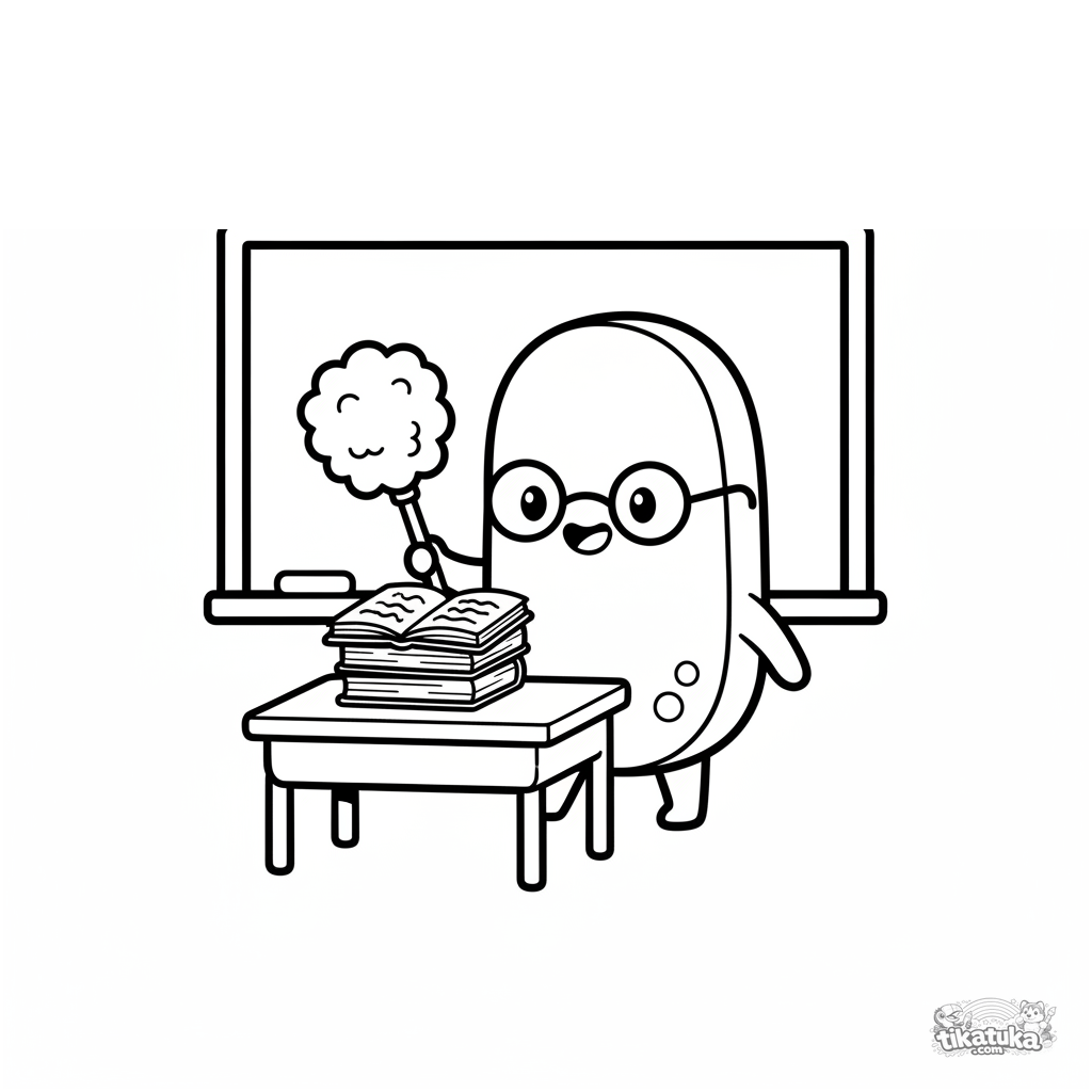 Простая раскраска для малышей 2-3 года: дружелюбный микроб-библиотекарь в очках раскладывает крошечные книжки на парте. Крупные формы, минимум деталей, для первых навыков раскрашивания.