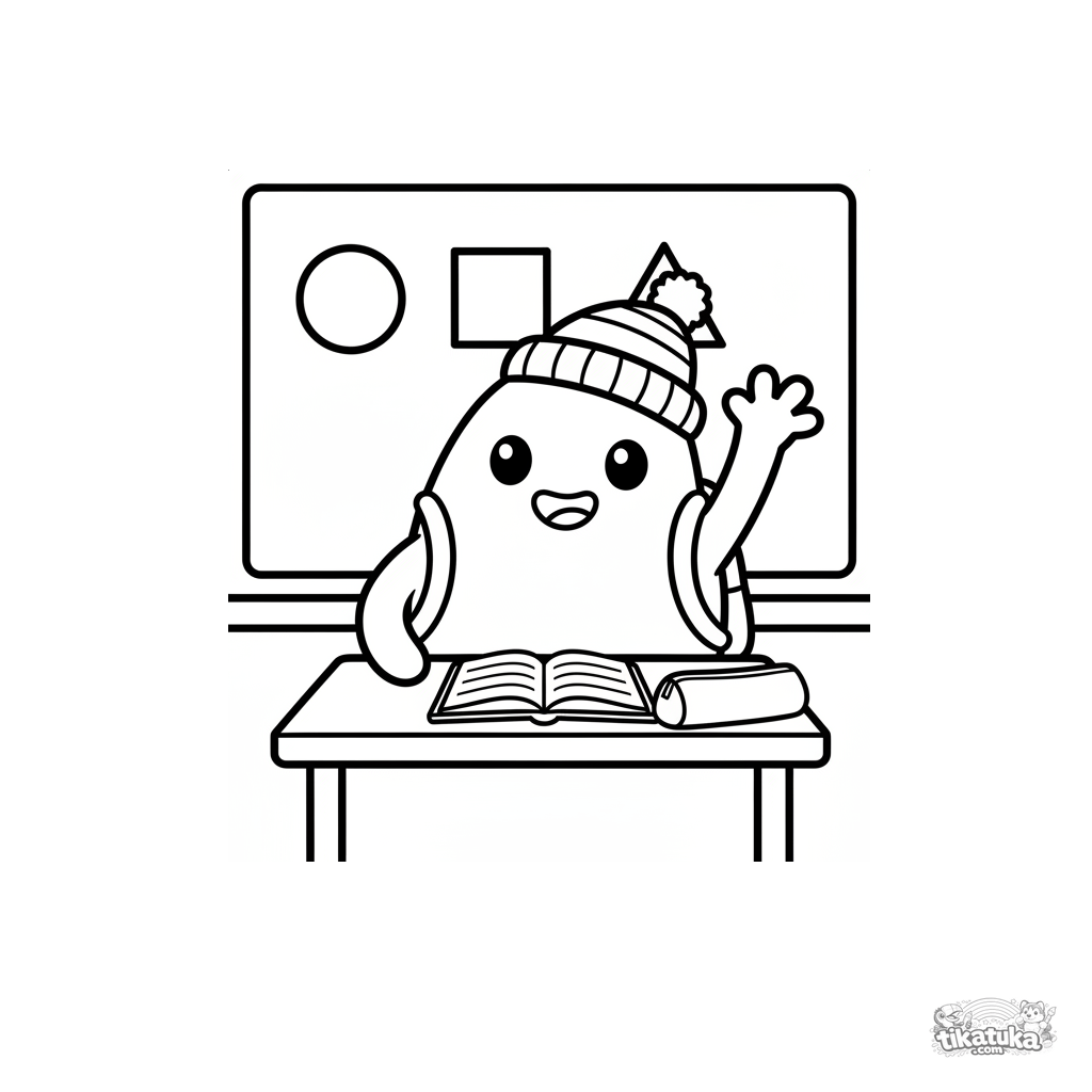 Раскраска для малышей 2-3 лет: весёлый микроб-ученик за партой поднимает руку у доски. Простые формы, крупные детали, широкие поля для раскрашивания.