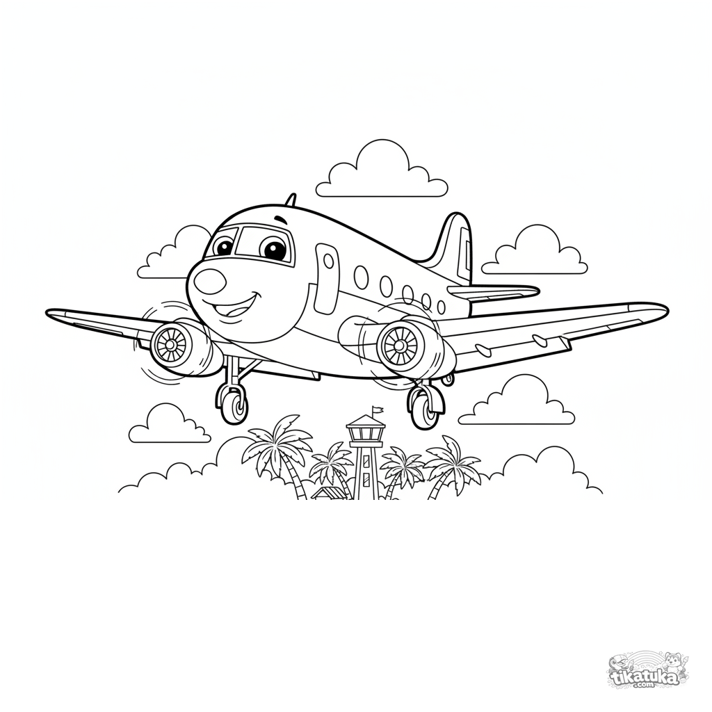 Раскраска для детей 7-9 лет: элегантный ретро-лайнер 1950-х заходит на посадку над тропическим островом. Чёткие формы, узнаваемый силуэт, приятная сцена.