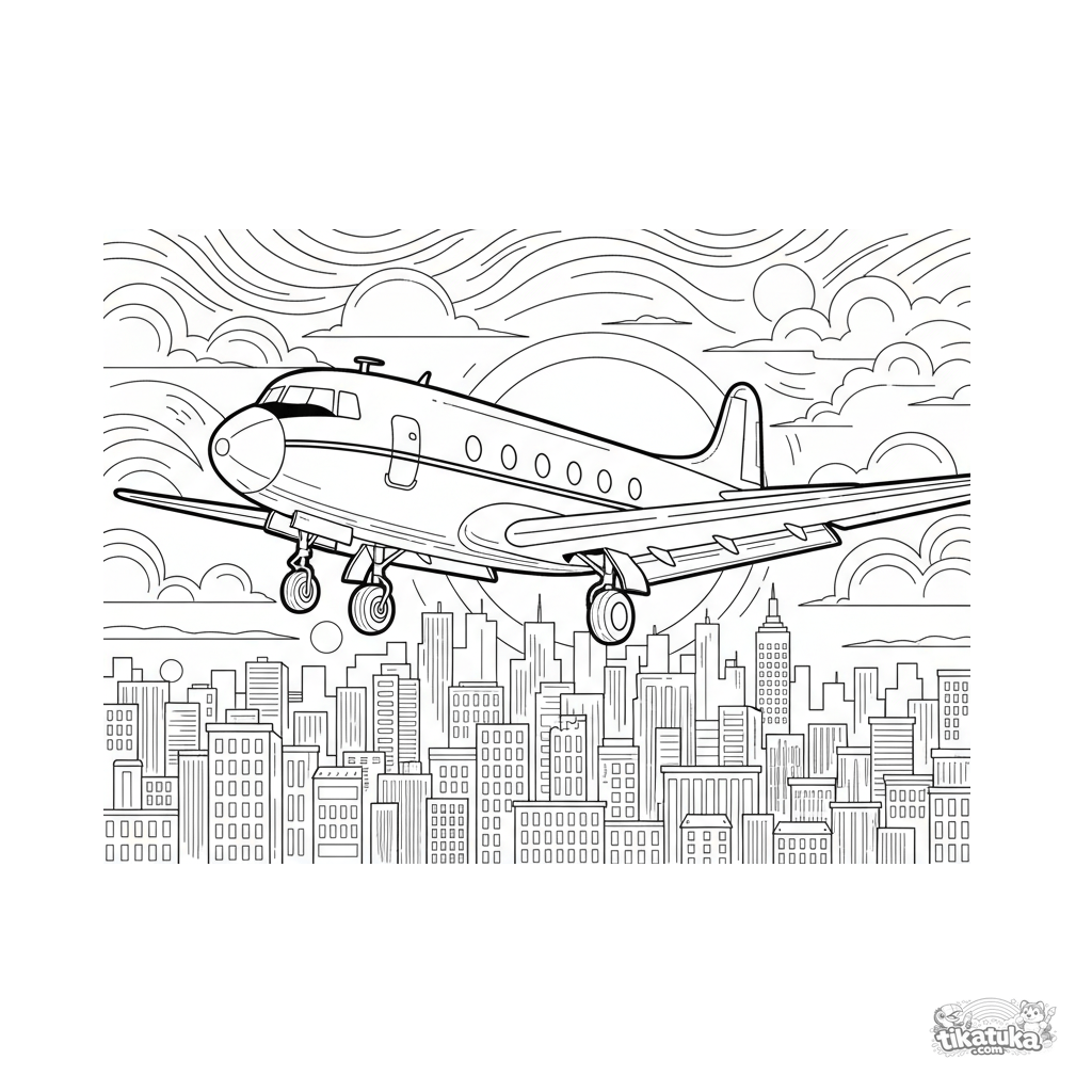 Раскраска для детей 7-9 лет: стильный авиалайнер 1950-х годов заходит на посадку над городом на закате. Умеренная детализация, узнаваемый силуэт, интересный фон.