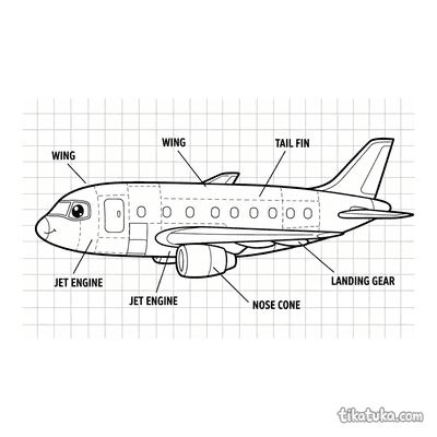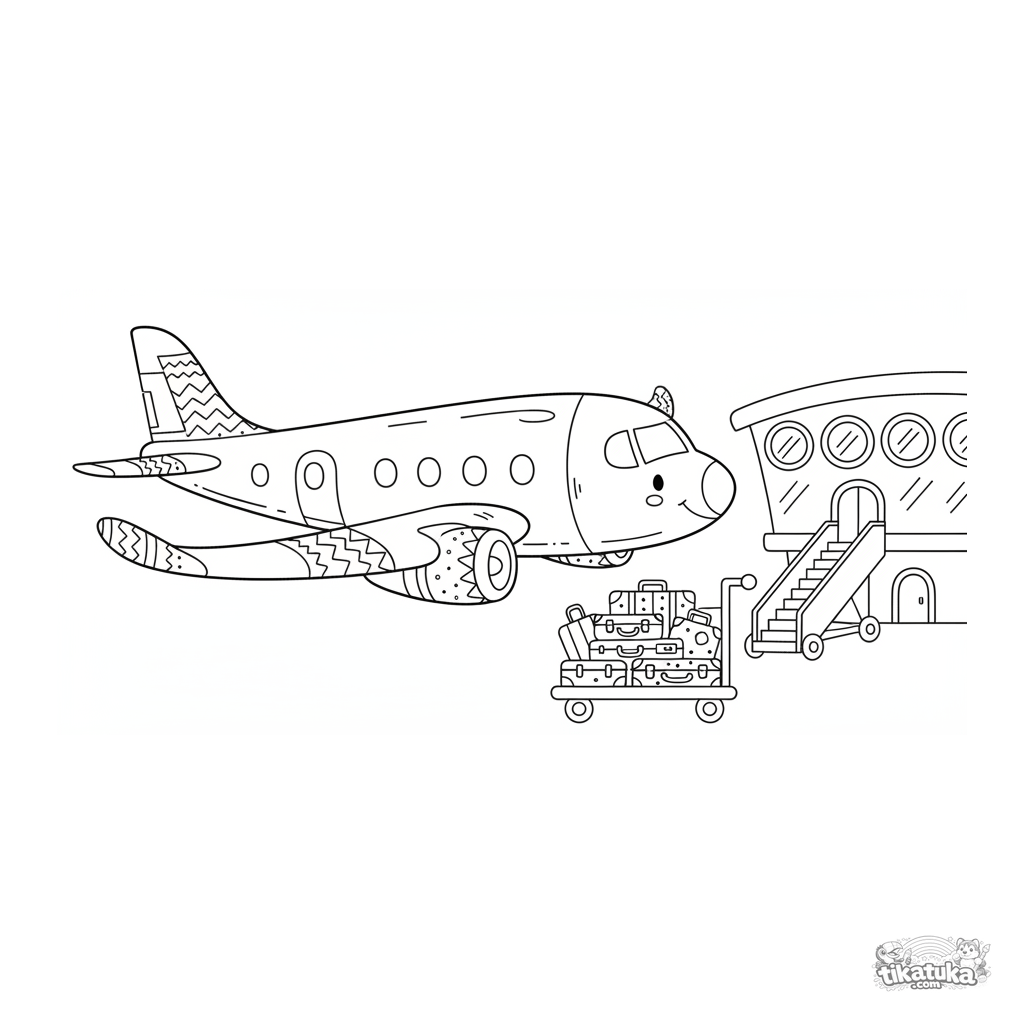 Сложная раскраска для детей 10-12 лет: авиалайнер середины XX века в стиле конструктивизма. Самолет рулит мимо терминала с деталями аэропорта.