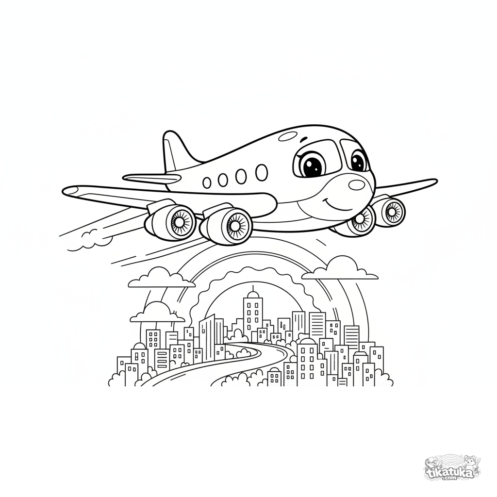 Раскраска ретро-авиалайнера для детей 7-9 лет. Элегантный самолет заходит на посадку над рекой к силуэту города на закате. Четкие контуры, умеренная детализация.