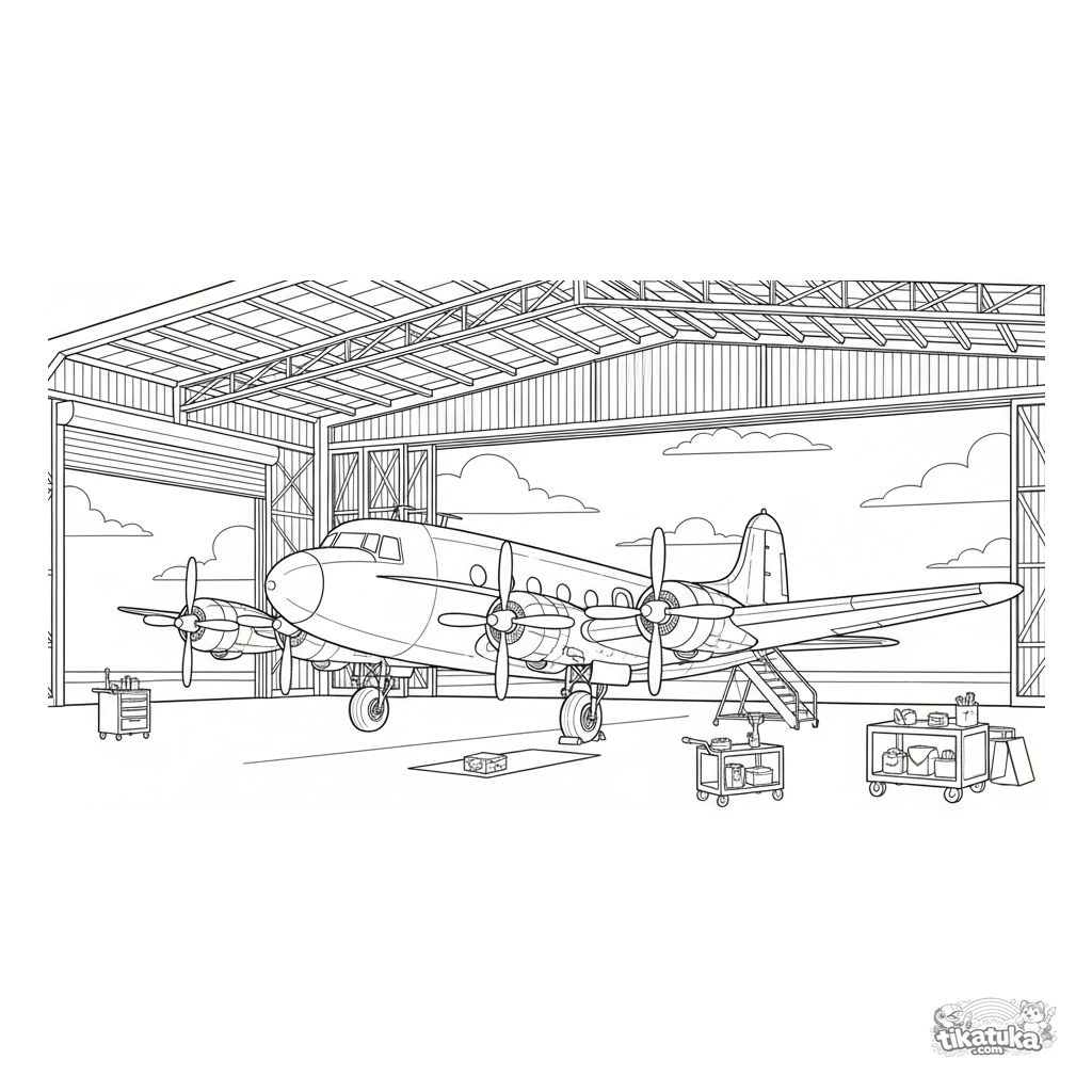 Раскраска элегантного пассажирского самолета 1950-х годов, стоящего в открытом ангаре. Видны лестница и тележки. Для детей 4-6 лет.