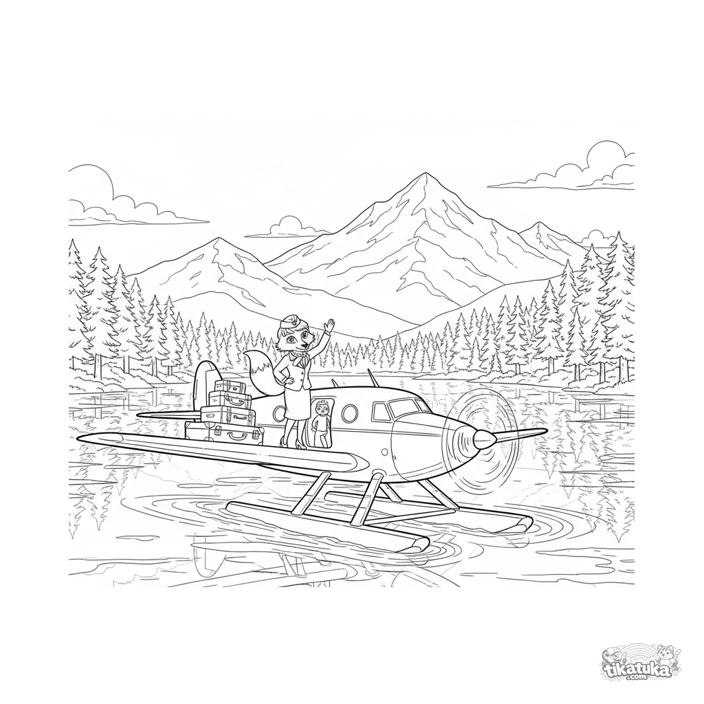 Детальная раскраска для детей 10-12 лет: элегантный пассажирский гидросамолет 1950-х годов на альпийском озере. Лиса-стюардесса приветствует пассажиров.