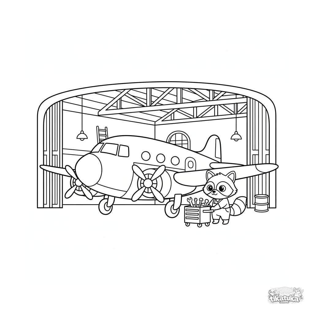 Раскраска для детей 7-9 лет: элегантный самолет 1950-х годов в ангаре. Четкие линии, интересные детали интерьера, дружелюбный персонаж.