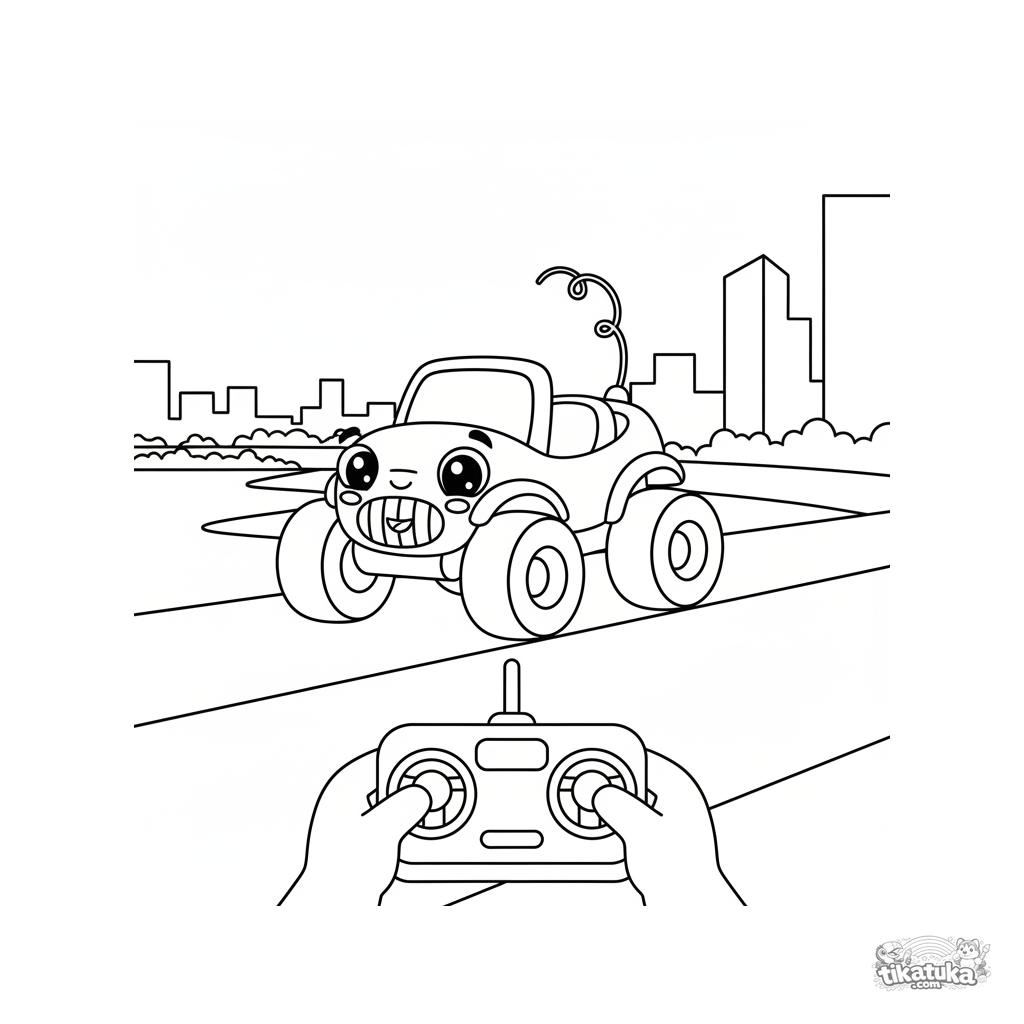 Раскраска для малышей: маленькая машинка на радиоуправлении стоит на ограждении большого моста над рекой. Очень простые формы, огромные поля для раскрашивания.