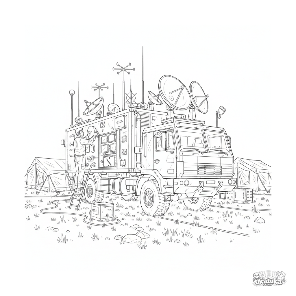 Раскраска для детей 10-12 лет: детализированный мобильный командный центр на шасси грузовика, покрытый антеннами. Техник на лестнице настраивает оборудование у палаток штаба.