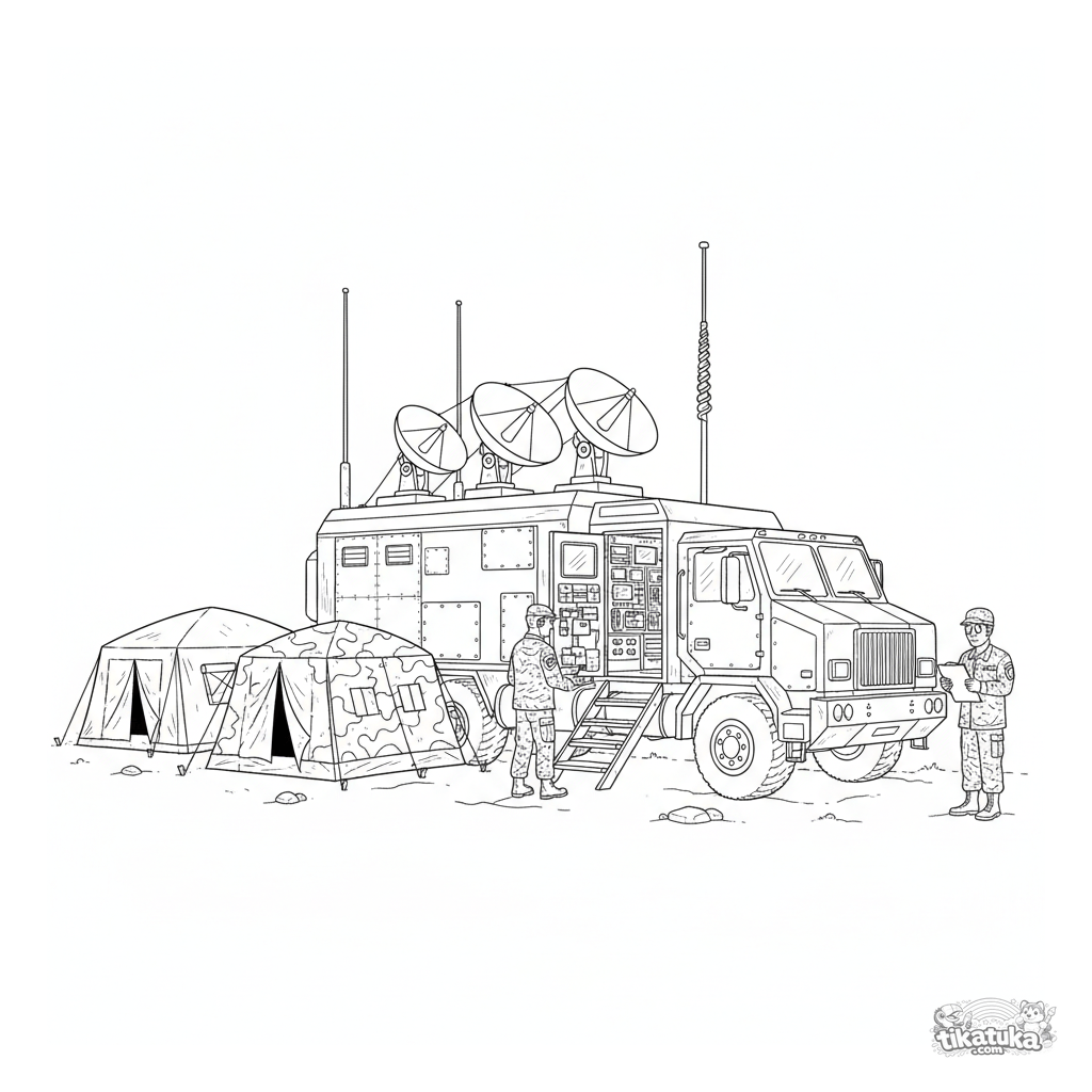 Раскраска для детей 10-12 лет: детализированная командно-штабная машина с антеннами припаркована возле полевого штаба. Солдаты готовят оборудование к работе.