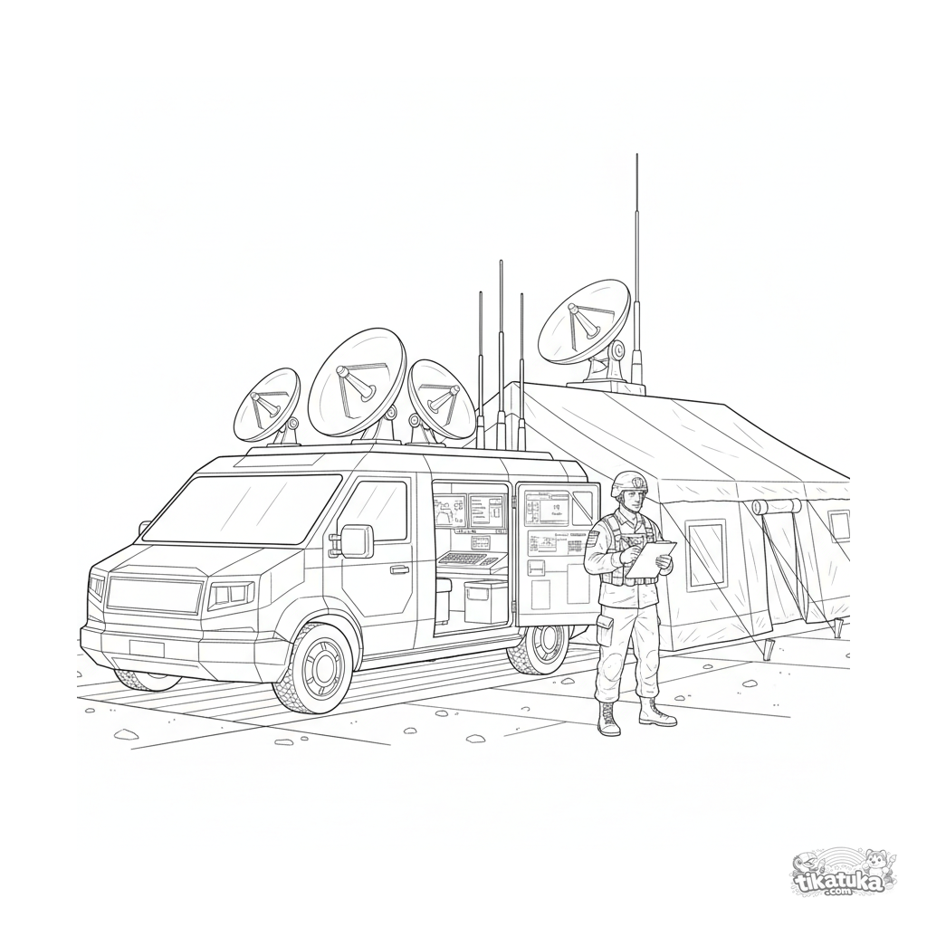 Раскраска для детей 10-12 лет: детализированный мобильный командный центр с антеннами возле штабной палатки. Открытый боковой отсек с мониторами, солдат с планшетом.