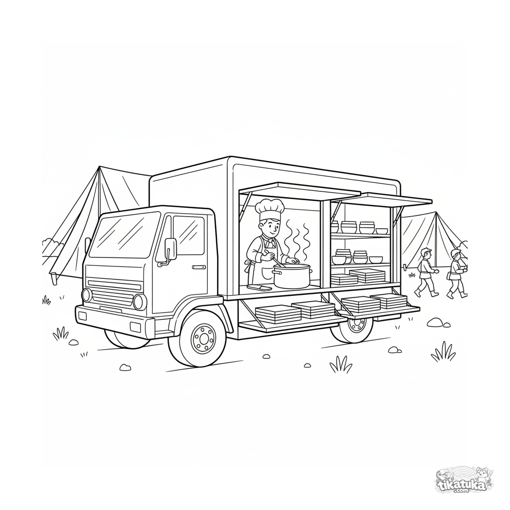 Раскраска для детей 4-6 лет: большой грузовик-полевая кухня готовит еду для солдат возле палаток полевого штаба. Понятная и интересная сцена.