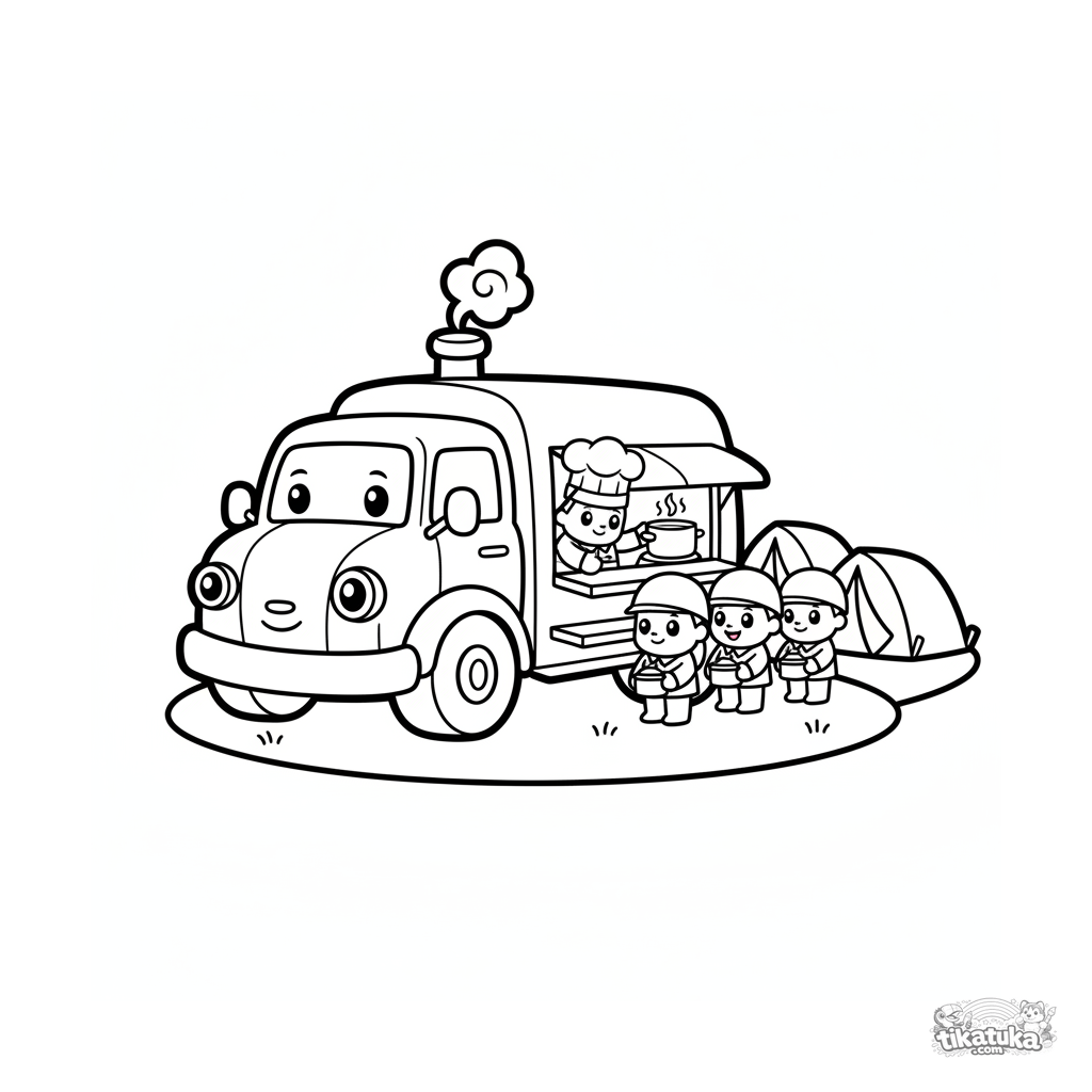 Раскраска полевая кухня для малышей 2-3 лет. Большой добрый грузовик раздает еду солдатам у палаток. Простые формы и широкие поля для раскрашивания.