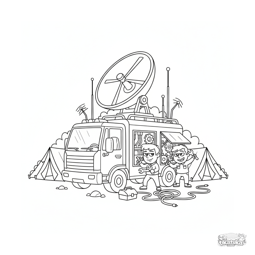 Раскраска для детей 7-9 лет: мобильный радарный грузовик на позиции возле полевого штаба. Техники работают с оборудованием. Динамичные линии, понятные детали.