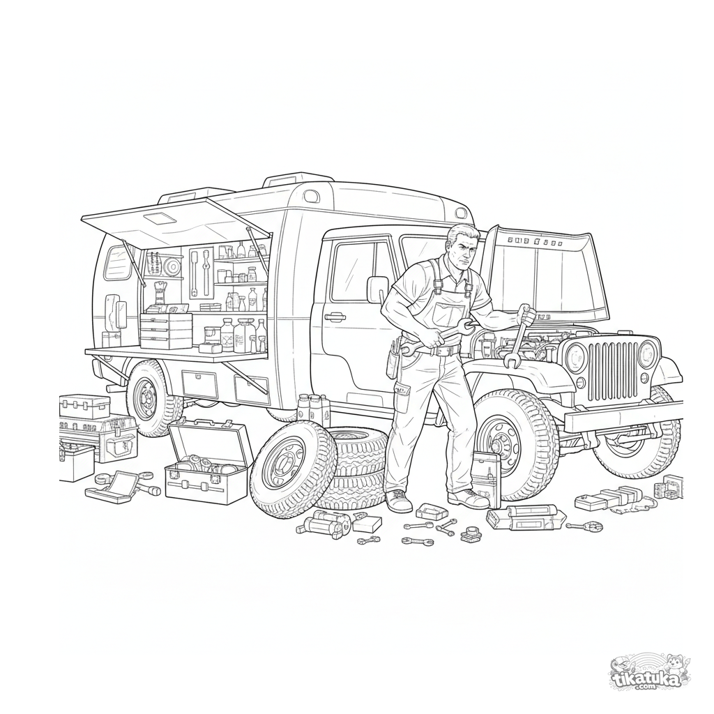 Сложная раскраска для 10-12 лет: детализированный грузовик-мастерская ремонтирует джип у палаток полевого штаба. Механик с инструментом. Много технических элементов, чёткие линии.