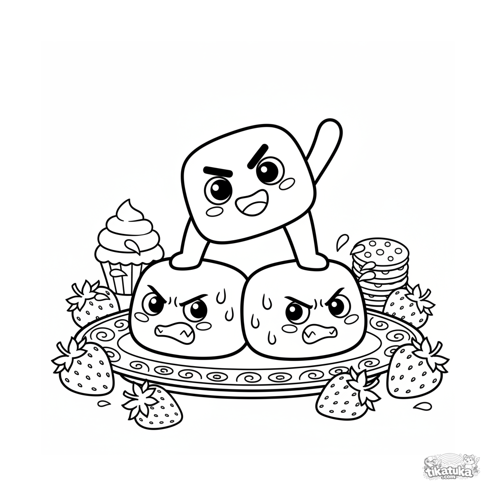 Раскраска для детей 7-9 лет. Три клубничных моти строят пирамиду на тарелке среди ягод. Динамичная сцена в стиле 90-х с выразительными эмоциями.