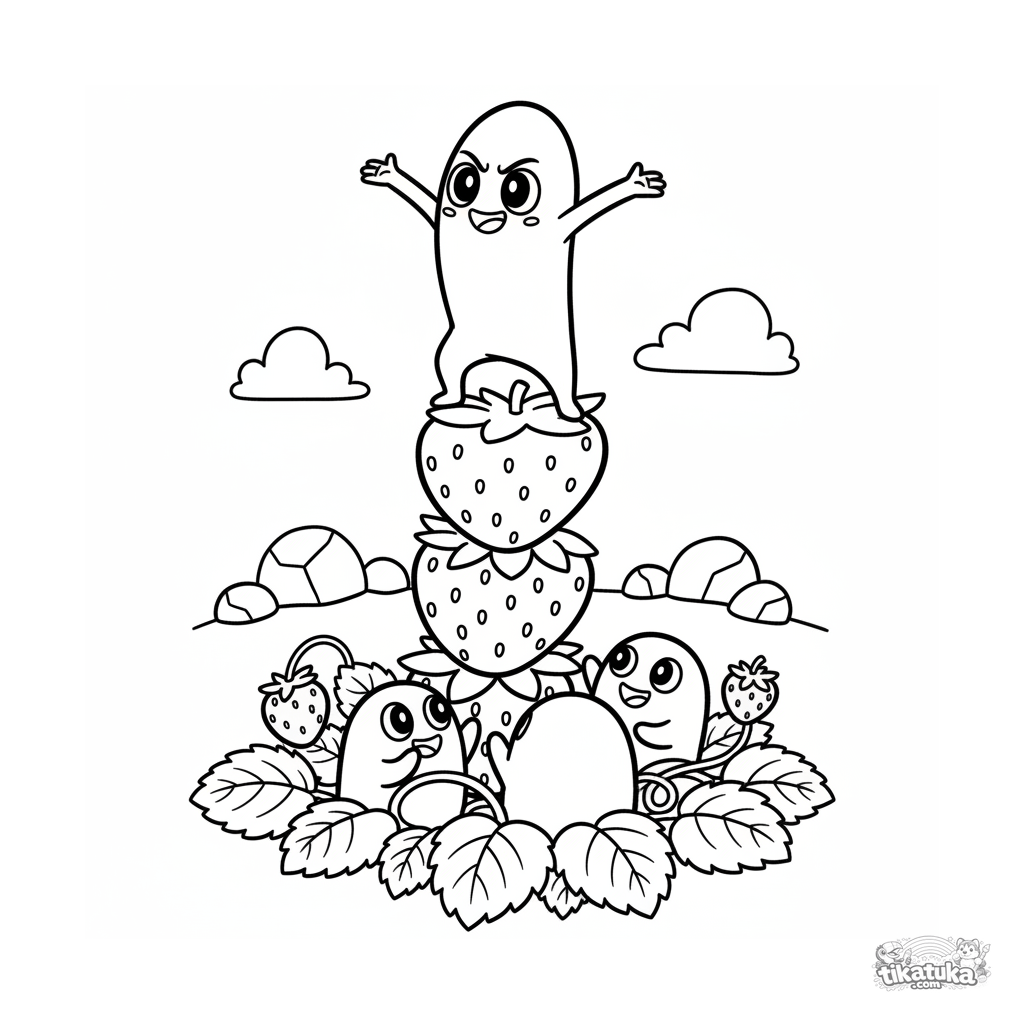 Раскраска в стиле 90-х: клубничный моти балансирует на башне из ягод. Динамичная сцена для детей 7-9 лет с наблюдающими друзьями.
