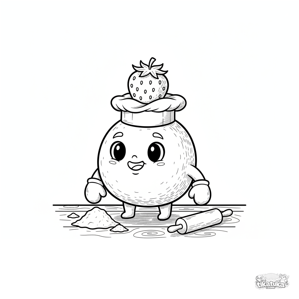 Детальная раскраска для 10-12 лет: клубничный моти в образе повара балансирует ягодой на голове на кухонном столе среди муки.