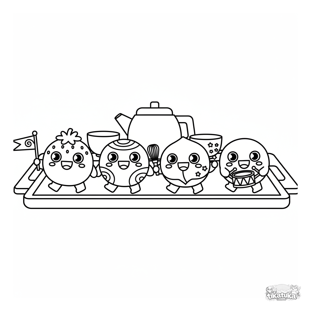 Раскраска с парадом разноцветных моти, марширующих по сервировочному подносу. Динамичная сцена для детей 7-9 лет с чайником и флажками.