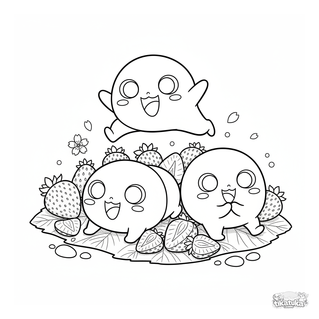 Раскраска для детей 7-9 лет: три весёлых моти играют в чехарду среди клубники на листовой подстилке. Динамичная сцена с разными позами и эмоциями.