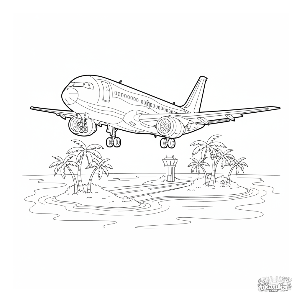 Раскраска современного авиалайнера, заходящего на посадку на тропический остров. Для детей 7-9 лет. Видны лагуна, пальмы и взлетно-посадочная полоса.