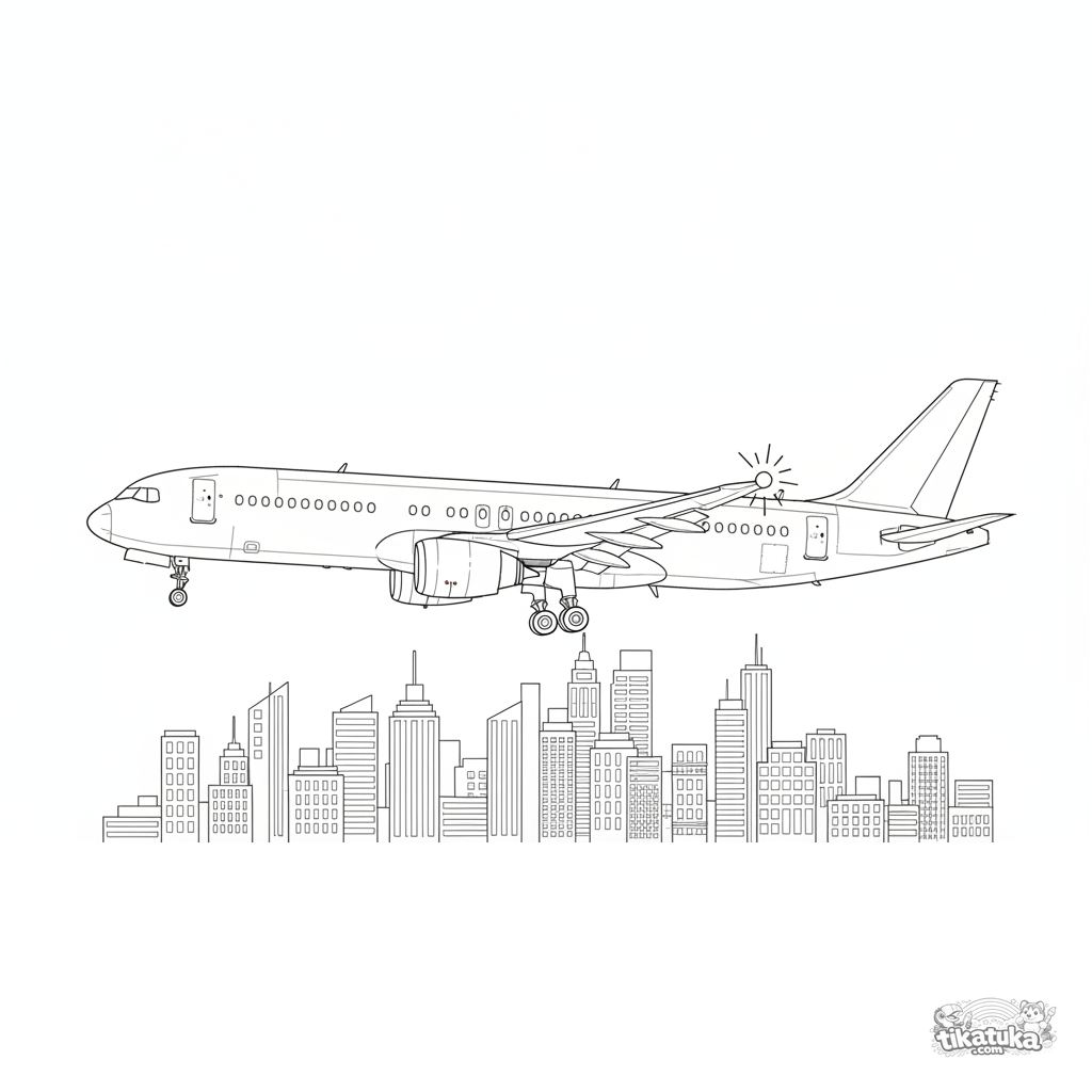 Раскраска для детей 10-12 лет: современный авиалайнер заходит на посадку над ночным городом. Детальная прорисовка, технические элементы.