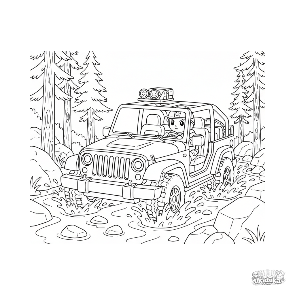 Раскраска современного военного джипа, пересекающего лесной ручей. Для мальчиков 7-12 лет. Детализированная сцена с брызгами воды, соснами и водителем.
