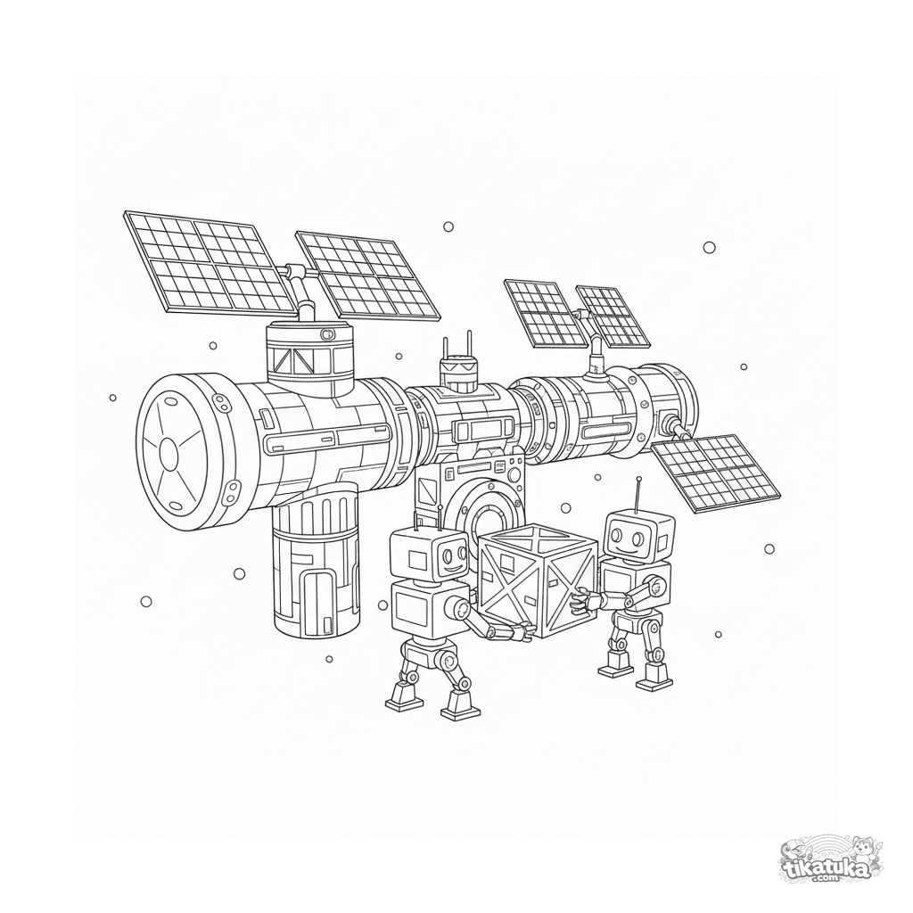 Раскраска для детей 10-12 лет: детализированная модульная космическая станция в открытом космосе, где роботы выполняют стыковочные операции. Технический чертежный стиль.