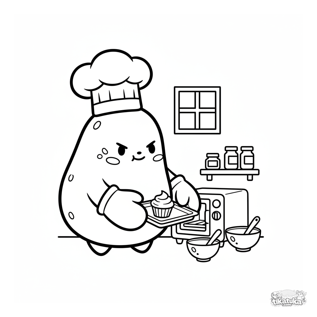 Раскраска для детей: монстр в колпаке повара и прихватках ставит кекс в маленькую духовку на мини-кухне. Забавная и милая кулинарная сцена.