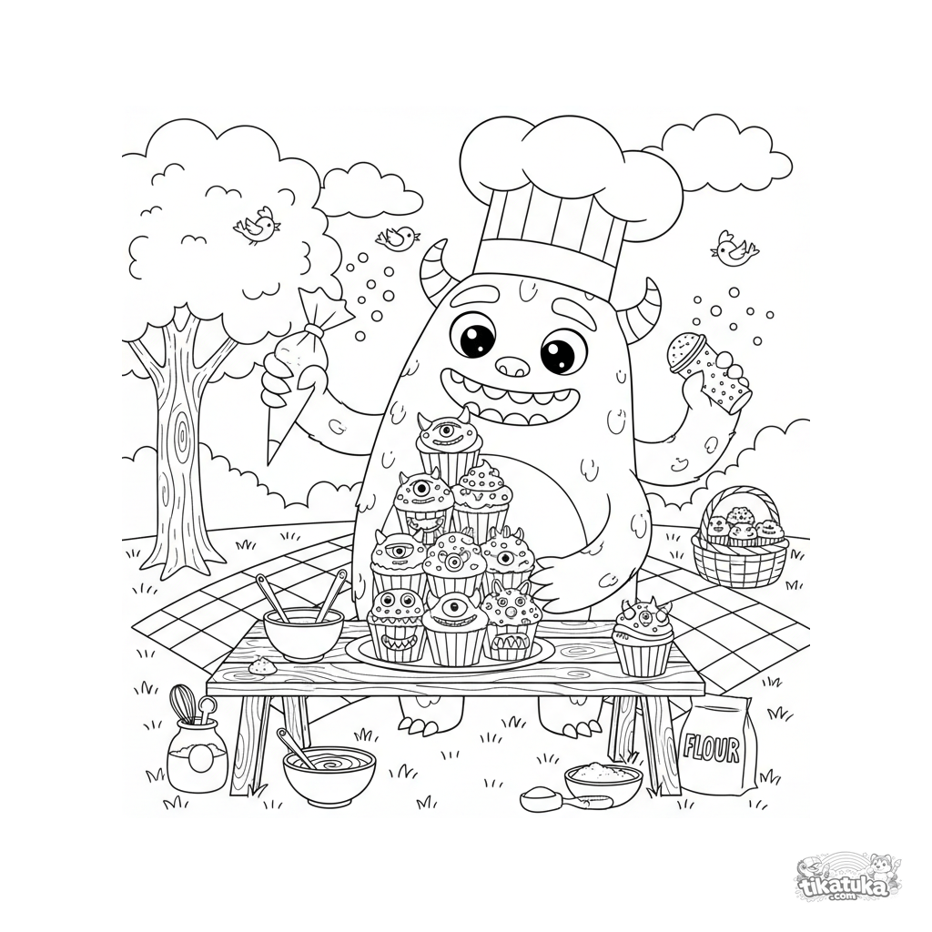 Детальная раскраска: монстр-повар с четырьмя руками украшает башню кексов на пикнике. Для детей 10-12 лет, много элементов и действий.