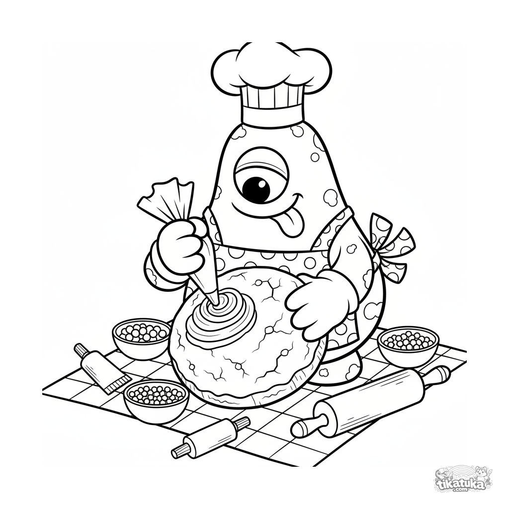 Сложная раскраска для детей 10-12 лет: монстр в колпаке шефа украшает гигантское печенье на пикнике. Много деталей, инструментов и выразительных элементов.