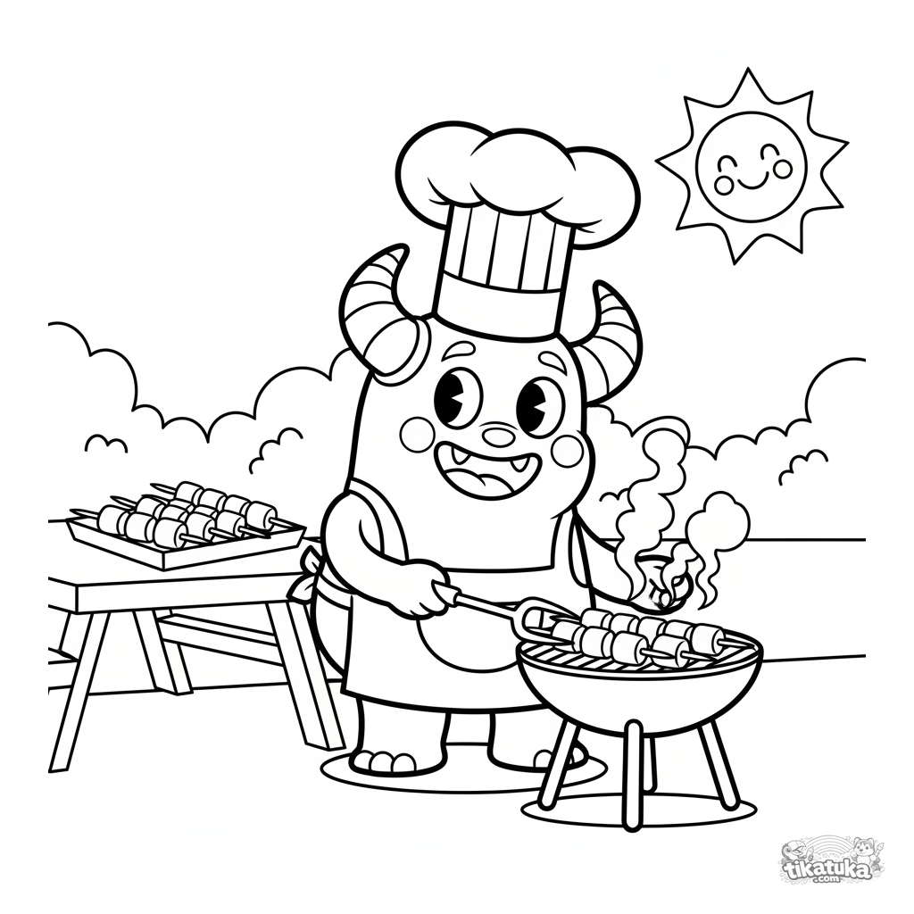 Раскраска для детей 4-6 лет: забавный монстр-повар в ретро-стиле жарит мармеладные шашлыки на пикнике. Весёлая сцена с грилем и угощениями.
