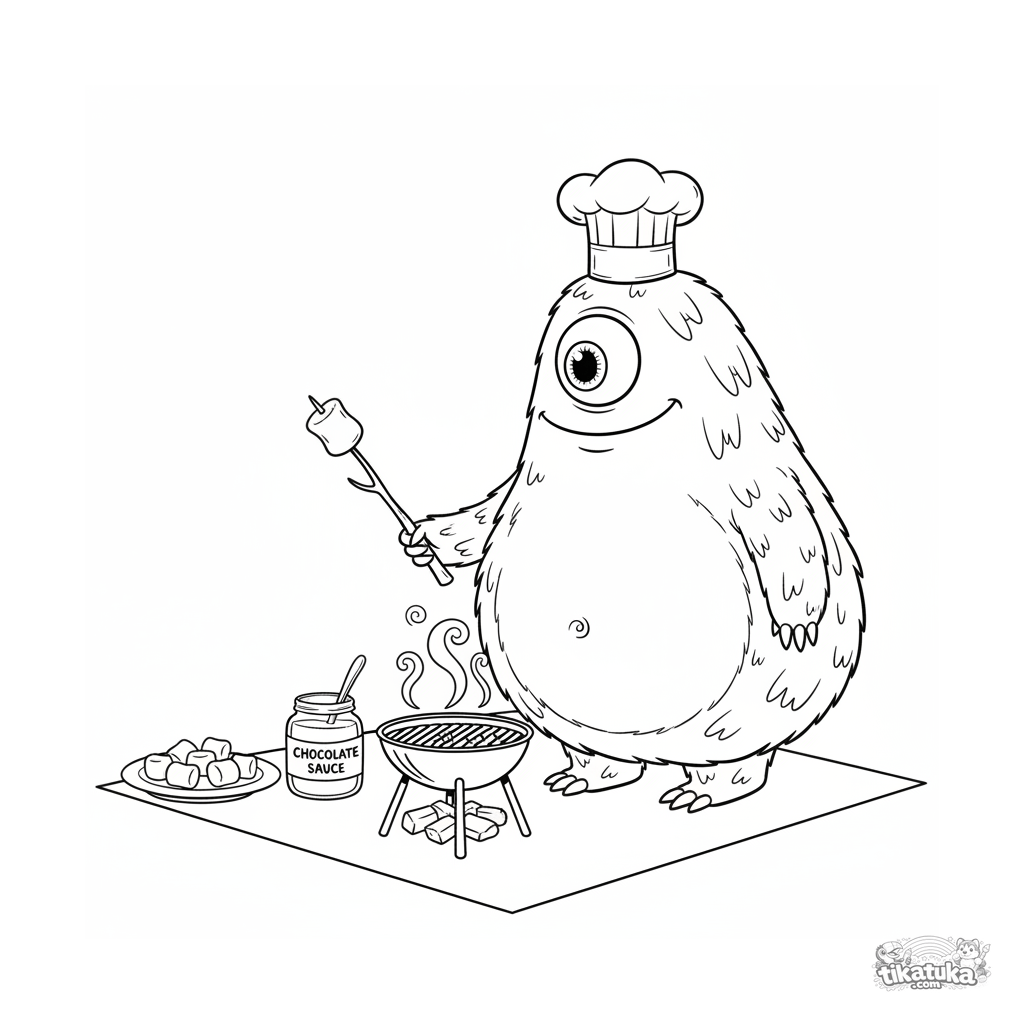 Сложная раскраска для детей 10-12 лет: монстр в колпаке шефа жарит зефир на пикнике. Детализированные контуры, реалистичные элементы сцены.
