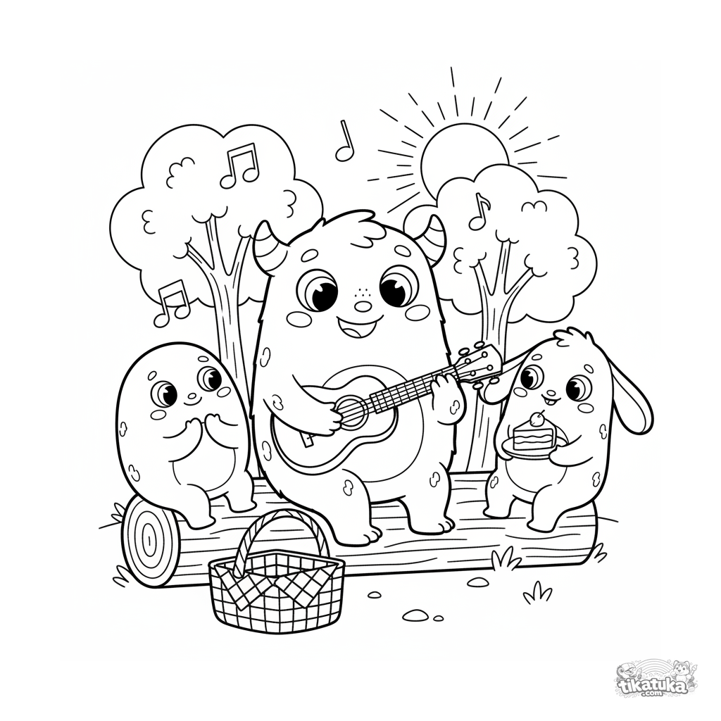 Раскраска для детей 7-9 лет: милый монстр в стиле книжной иллюстрации играет на укулеле для друзей на пикнике. Тёплая и весёлая сцена.