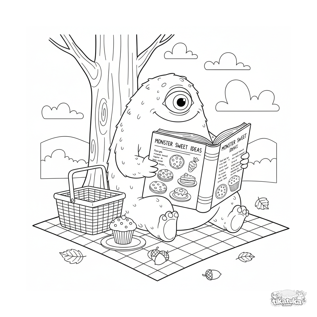 Детальная раскраска в реалистичном стиле: монстр читает большую кулинарную книгу под деревом на пикнике. Для детей 10-12 лет, много текстур и элементов.