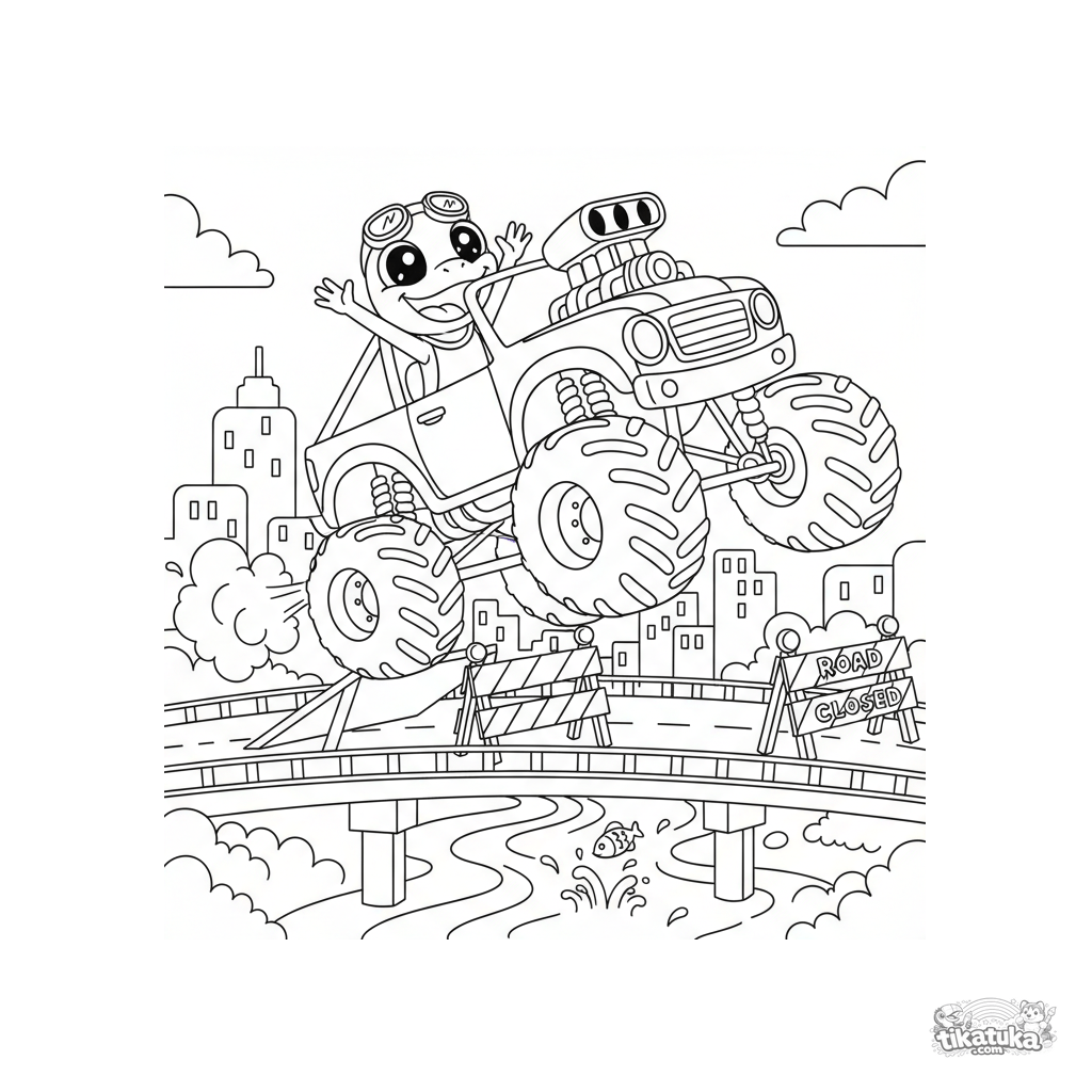 Раскраска для детей 7-9 лет: огромный монстр трак совершает захватывающий прыжок с трамплина, установленного на городском мосту над рекой. Ящерица-водитель ликует. Динамичная композиция, умеренная детализация.