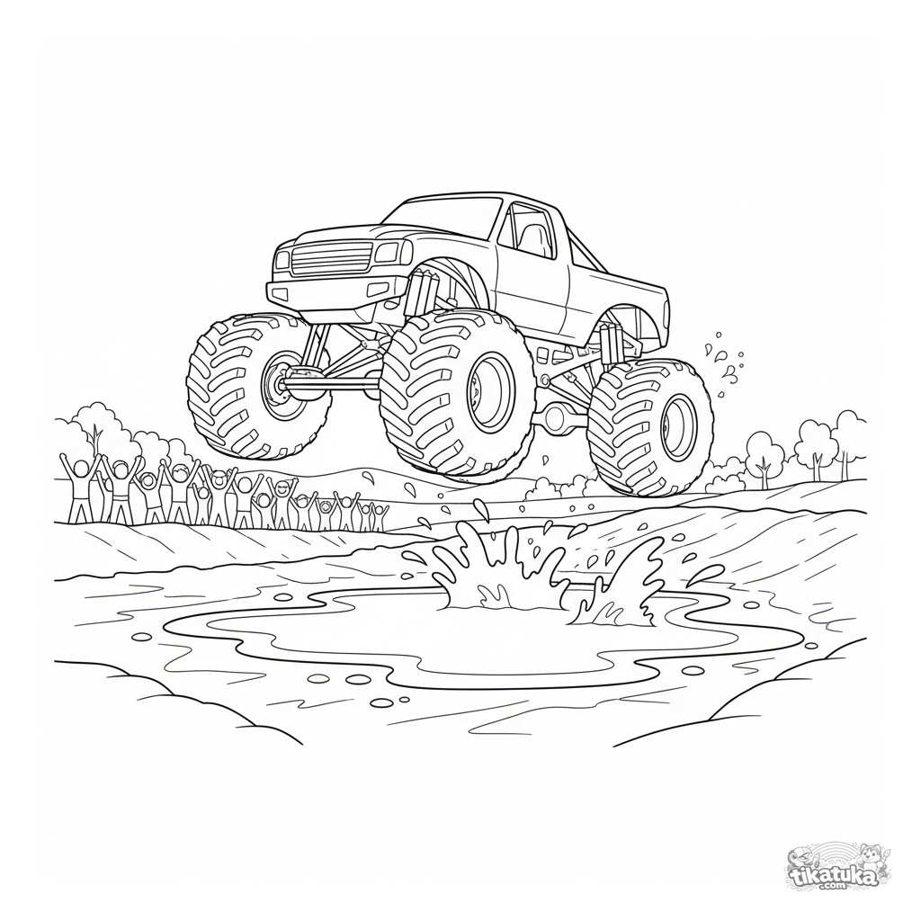Раскраска для мальчиков 4-6 лет: крутой монстр-трак с огромными колёсами совершает прыжок через брызгающую лужу грязи на грунтовой трассе. Энергичная, детализированная сцена.